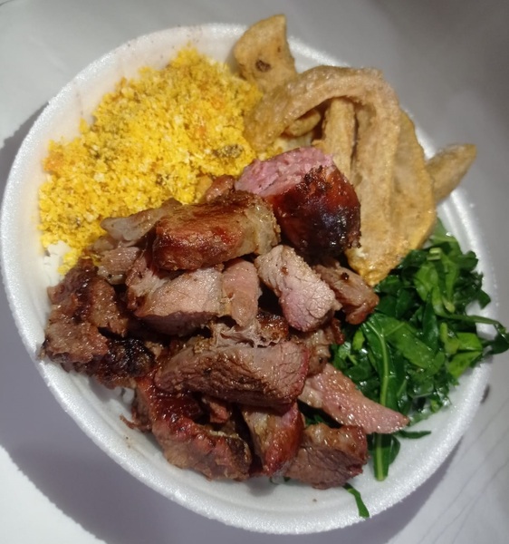 Marmitex C/feijoadaArroz, feijoada, churrasco, couve , torresmo e farofa. *não fazemos substituiçoes de alimentos(Pequena) R$ 26,00 / (Media) R$ 32,00 / (Grande) R$ 37,00